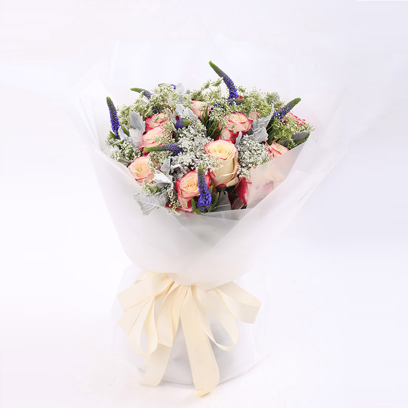 进口厄瓜多尔甜心玫瑰x19朵,进口紫色鼠尾、白色蕾丝、银叶菊点缀。免费附送精美贺卡,代写您的祝福。