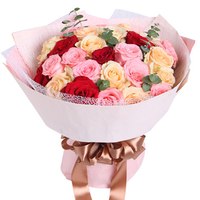 戴安娜粉玫瑰x11枝 香槟玫瑰x13枝 红玫瑰x5枝 尤加利叶点缀。