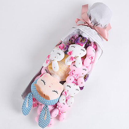 品牌metoo梦幻黄布偶娃娃1个,白色爱心兔3只,粉色爱心兔6只,勿忘我干花适量