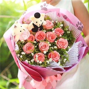 - 备注:花材:11朵粉色玫瑰,黄英,满天星搭配。 包装:白色网编席内包,粉色硬纸外包,粉色蝴蝶结束花。 赠送:免费附送精美贺卡,代写您的祝福。 其它:由于花材的季节原因和手工包扎。